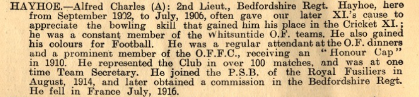 27th July 1916 – A.C Hayhoe dies in action at Longueval during the Battle of the Somme. Hayhoe represented OFFC on over 100 occasions and served as Team Secretary.