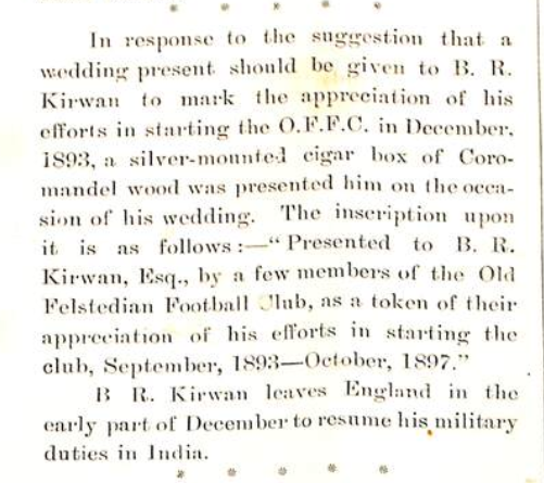 20th October 1897 – Kirwan is gifted an inscribed silver mounted cigar box as a wedding present, as a token of OFFC’s appreciation of his efforts to form the club.